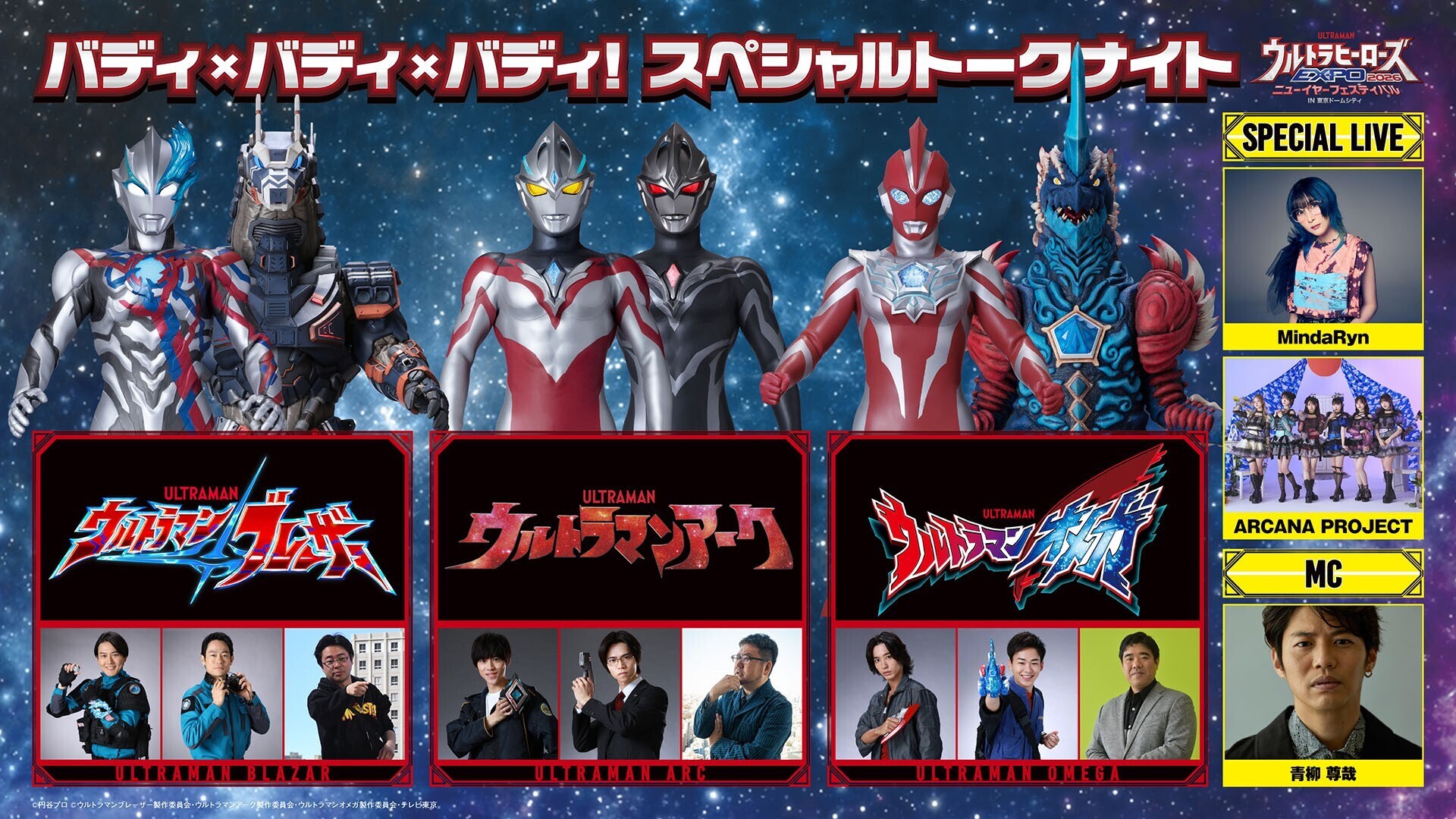 2025年12月26日(金)~2026年1月4日(日)の期間、東京ドームシティ プリズムホールにて開催される「ウルトラヒーローズEXPO 2026 ニューイヤーフェスティバル IN 東京ドームシティ」にて、12月29日(月)にテレビシリーズ最新3作品の出演者や監督によるトークイベント「ブレーザー×アーク×オメガ バディ×バディ×バディ!スペシャルトークナイト」の追加開催が決定!