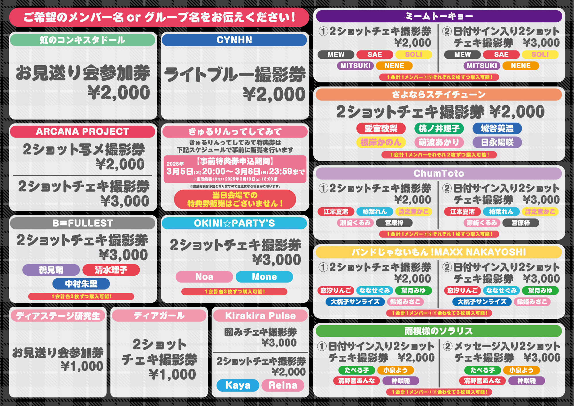 雨模様のソラリス/ARCANA PROJECT/OKINI☆PARTY'S/きゅるりんってしてみて/さよならステイチューン/CYNHN/ChumToto/虹のコンキスタドール/バンドじゃないもん!MAXX NAKAYOSHI/B≡FULLEST/ミームトーキョー